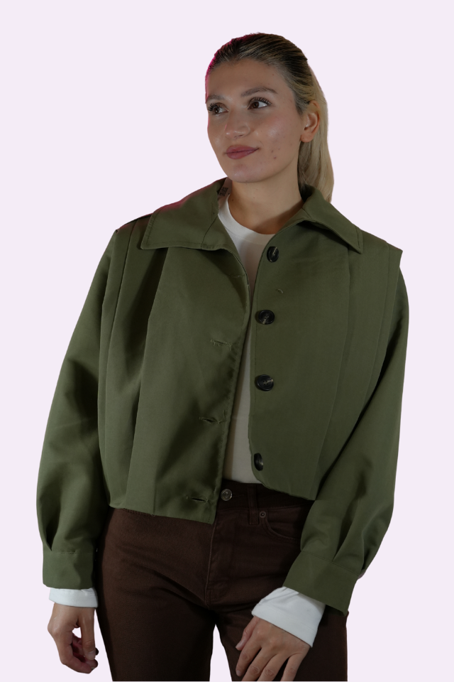Bu ceket ile stilinizi bir adım öne taşıyın! Yüksek belli pantolon, etek ve şortlarla harika bir uyum yakalayan ultra crop kesimi ile bu parça, tüm dikkatleri üzerinize çekecek. Rahat ve modern bir görünüm sunan düşük omuzlu tasarımı ve geniş yakası, cekete karakteristik bir hava katıyor. Klasik düğme detayları ve zamansız haki rengi sayesinde, hem casual hem de daha iddialı kombinlerinizde rahatlıkla kullanabilirsiniz.