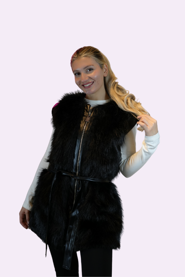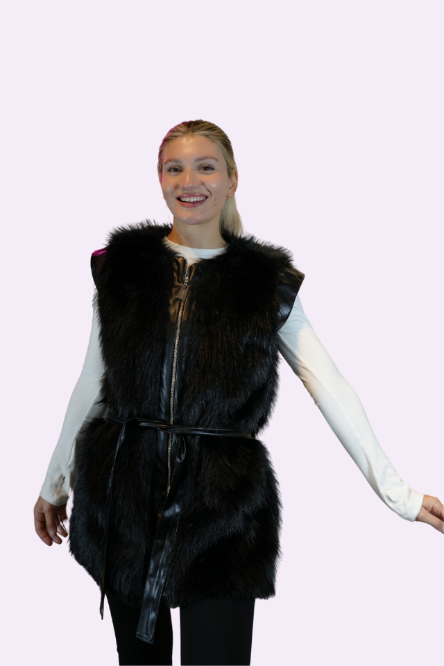 Siyah uzun tüylü suni kürk yelek, belindeki suni deri kuşak detayı ile vücuda zarif bir silüet kazandırır. Fermuar ve kuşak detayıyla hem şık hem de modern bir katmanlama parçasıdır.