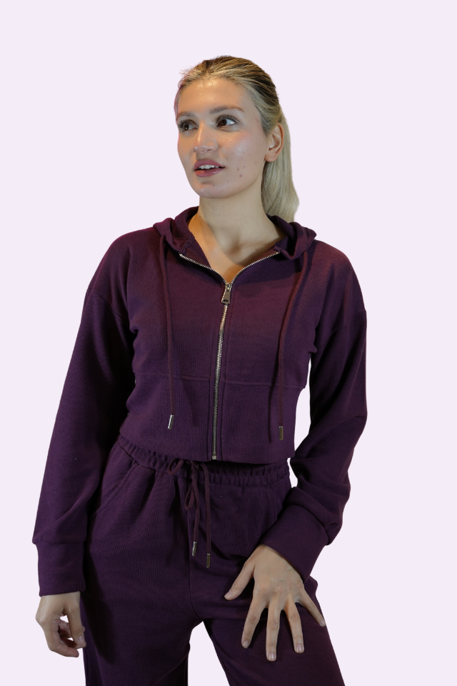 Fitilli Bordo Fermuarlı Crop Kapüşonlu Takım