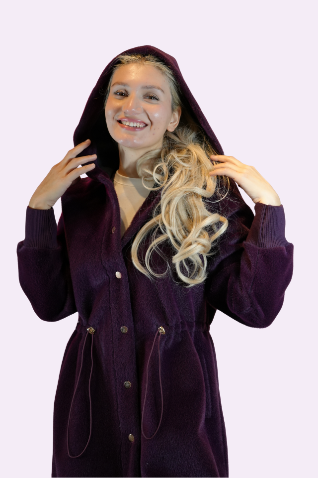 İddialı mor rengi ve yumuşacık peluş dokusuyla kış aylarına stil katan, uzun parka. Kapüşonlu yapısı, büzgülü kordon beli ve ribanalı kollarıyla hem sıcak hem de modern bir görünüm sunar.