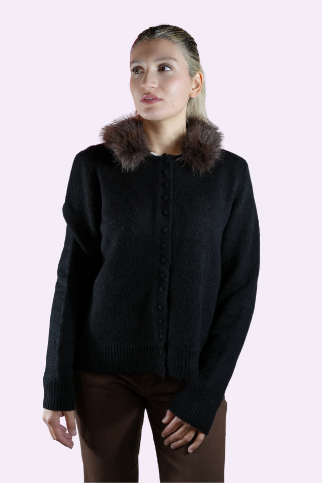 Kürk Yaka Detaylı Düğmeli Siyah Triko Hırka