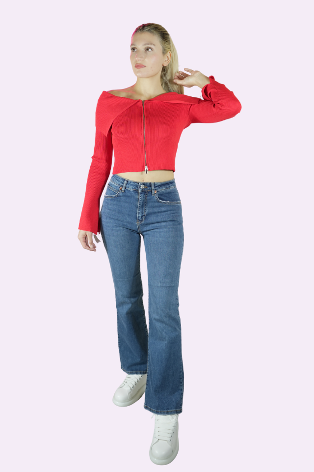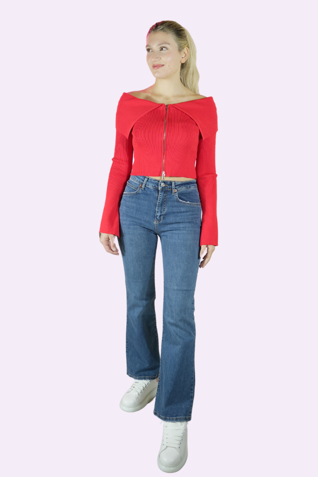 Madonna Yaka Fermuarlı Kırmızı Örme Hırka