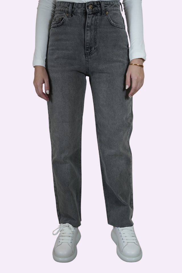 Koyu gri (füme) renkte, yüksek belli ve rahat kesimli jean pantolon. Günlük stilde modern ve rahat bir görünüm sunar. Beyaz spor ayakkabılarla kombinlenerek tamamlanmıştır.