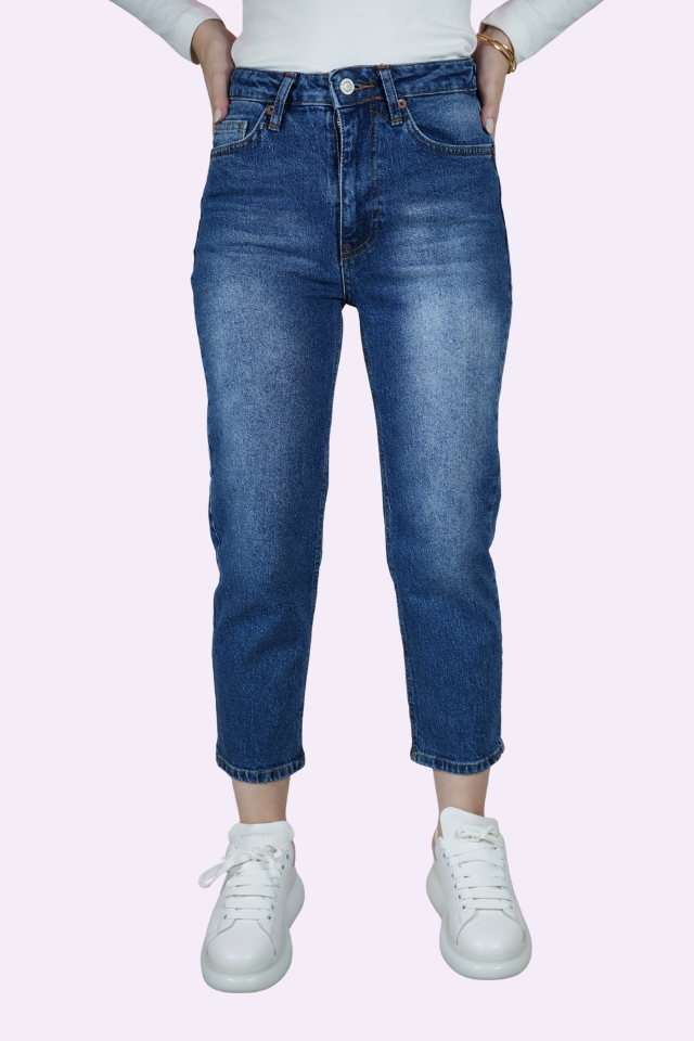 Orta mavi renkte, yüksek belli ve rahat kesimli, bilek üstünde biten (crop) kot pantolon. Ön kısmındaki belirgin ağartma detaylarıyla günlük stile dinamik bir hava katar.