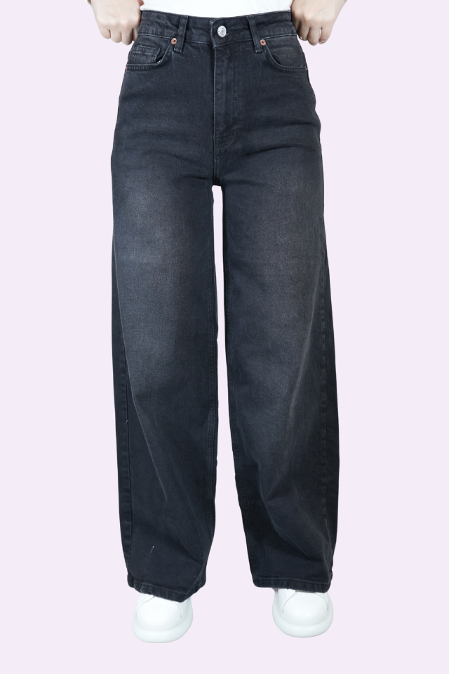 Koyu siyah (füme) yıkamalı, yüksek belli ve son dönemin trendi olan geniş paça (wide leg) kesimli kot pantolon. Rahat ve modern bir sokak stili için idealdir.